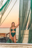 Emerald Green cutout one piece with non tarnish hoop and charm detailing by Get Linked Studio. One Piece features a super flattering high-on-the-hip cut, cheeky coverage and adjustable shoulder ties.