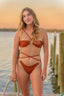 Adjustable halter top and angeled cheeky bottom with non tarnish hoop and charm detailing by Get Linked Studio. Textured rust ultra stretch fabric. This suit can be made in any size and with any solid color or featured print! Please include your measurements if you would like your suit to be adjusted accordingly.