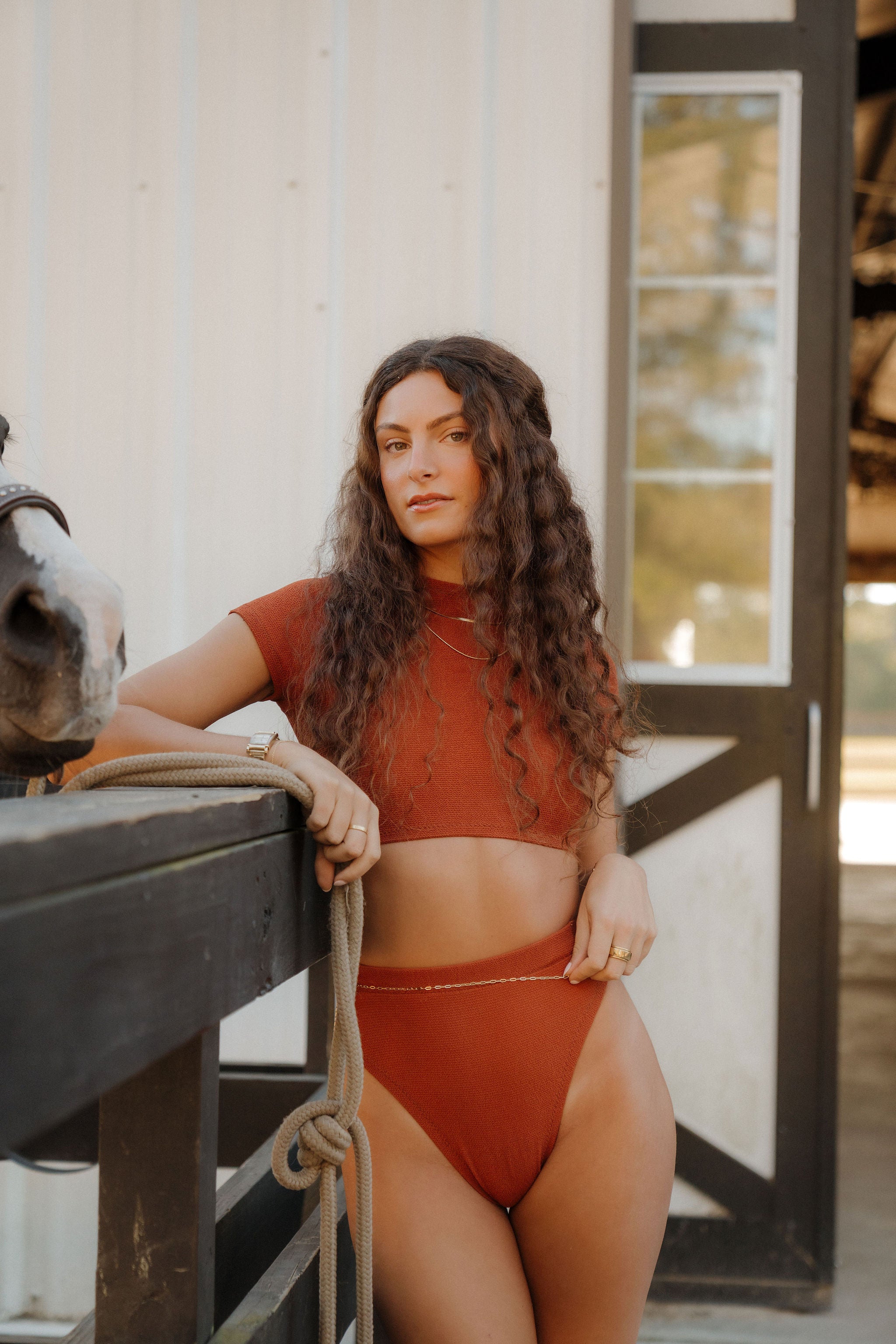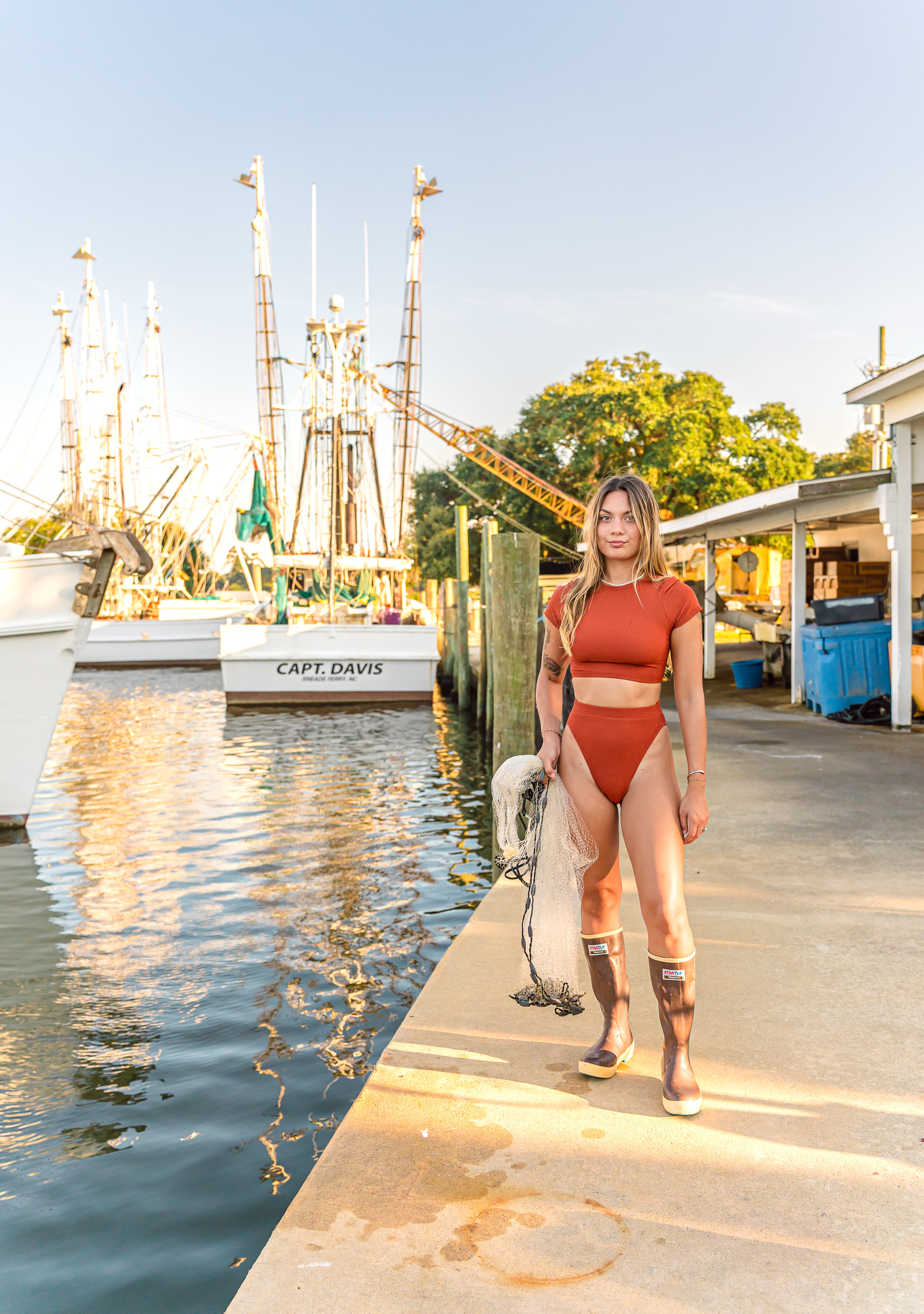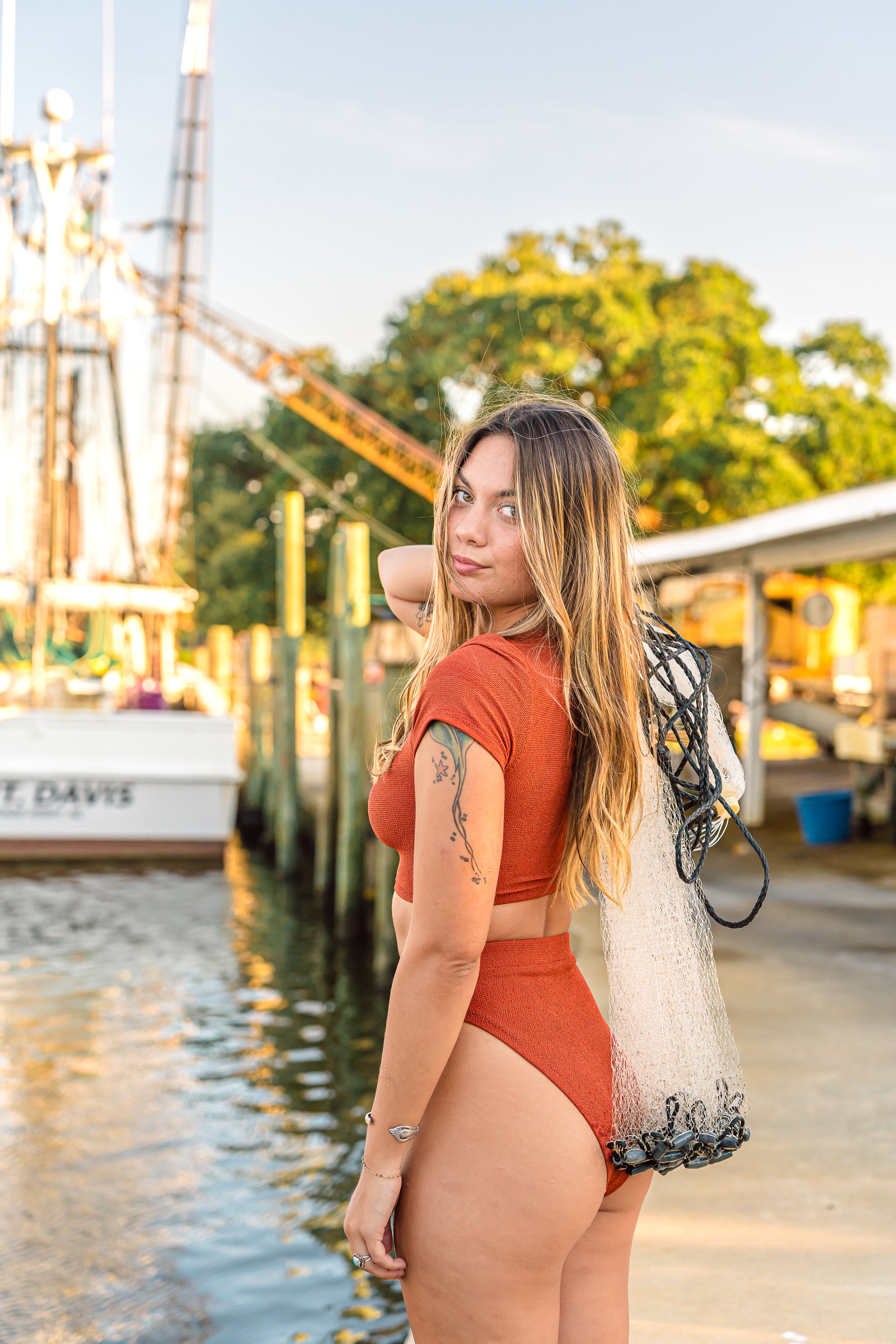 Rashguard style cap-sleeve top with high-on-the-hip moderately cheeky bottom in a textured ultra stretch fabric. This suit can be made with more or less coverage per request.